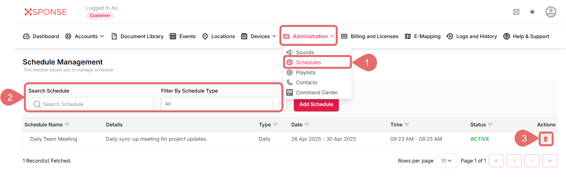 Occasionally, you may need to remove a schedule that is no longer needed. Deleting a schedule ensures that your management interface remains organized and free of unnecessary entries.