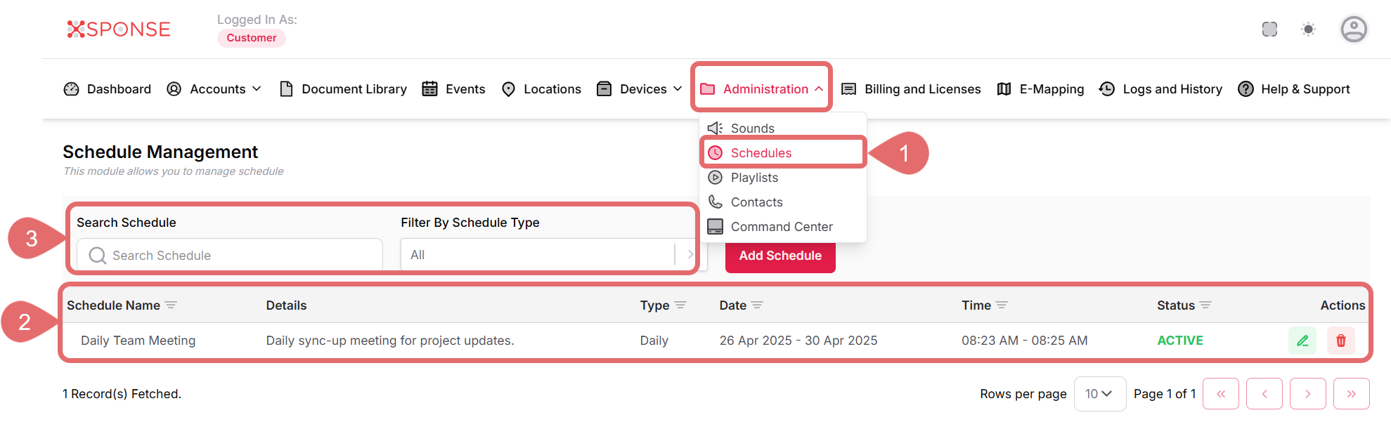 3. Use the Search Schedule bar to find schedules by name or filter them as needed.